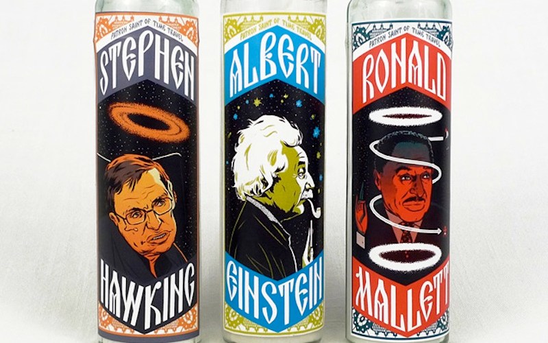 There are three new products available at the Echo Park Time Travel Mart: Patron Saints of Time Travel candles created by me and designed by the the insanely talented Mickey Duzyj. This is a project I’ve been wanting to do for a long time, but it wasn’t until Mickey came on board that things really got moving. Not only did Mickey knock the design out of the freaking park, he also seems to have learned a fair bit about theoretical physics to boot. What’s more, he created this awesome animation: