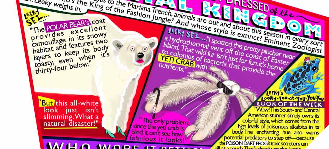 The Goods is a gallimaufry of games, puzzles, comics, and diversions, presented by McSweeney’s. It appears in newspapers across the U.S. and Canada. I created and wrote one-off pieces as well as several recurring features, such as “Dr. Leeky’s Best and Worst Dressed Of The Animal Kingdom” and “Cook With Your Face.” Other contributors include Jon ScieszkaCollin MelloyCarson EllisSam Potts, and Jon Klassen.